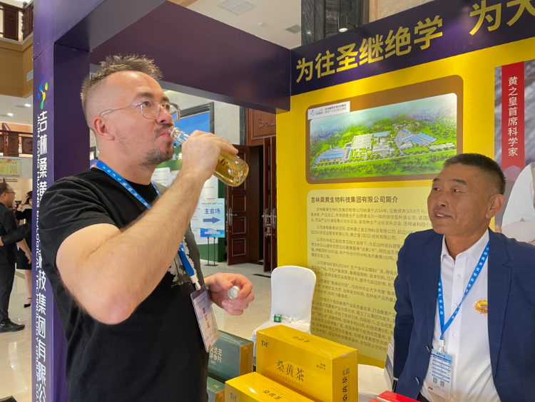 會場外特設(shè)產(chǎn)品展區(qū)。桑黃茶、蜂蜜、切片、凍干、復(fù)合精粹飲……令參會者耳目一新?!坝型甑奈兜馈保砹_斯科學(xué)院西伯利亞分院高級研究員維亞切斯拉夫·弗拉森科現(xiàn)場品嘗了桑黃樺樹汁和桑黃凍干。他表示,中國的企業(yè)能將科研成果迅速轉(zhuǎn)化,產(chǎn)出對人民有益的健康產(chǎn)品,令他非常驚訝,回國后他將分享在本次大會中的所見所聞所思。
