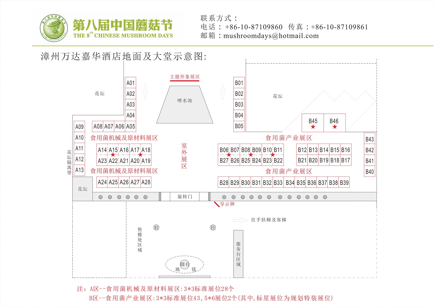 本屆展覽分為室內(nèi)展區(qū)和室外展區(qū),共計1,500平方米。其中室內(nèi)展區(qū)為萬達(dá)嘉華酒店三樓宴會前廳(正對蘑菇節(jié)論壇主會場出入口),設(shè)置標(biāo)準(zhǔn)展位12個。室外展區(qū)位于萬達(dá)嘉華酒店室外停車場,設(shè)置標(biāo)準(zhǔn)展位68個,室外展區(qū)均搭設(shè)棚架,使其不受天氣等外界因素影響。