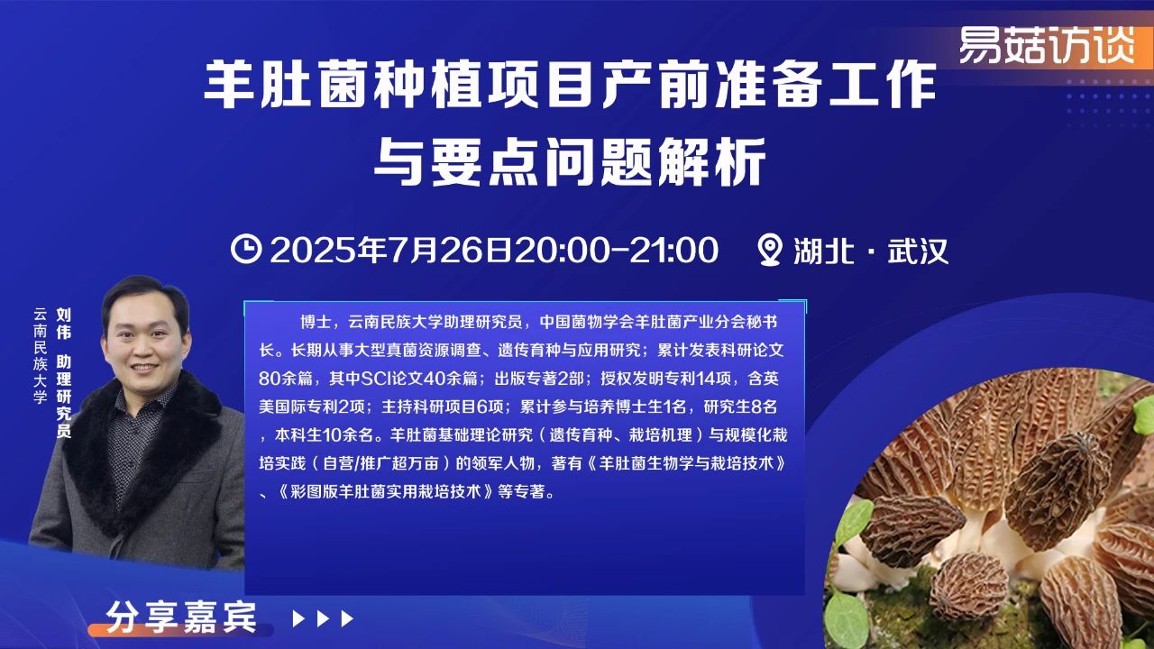 想了解更多具體的羊肚菌種植核心技術(shù)與實操要點,由易菇網(wǎng)主辦的 2025 羊肚菌(珍稀菌)栽培技術(shù)高級研修班將于 8 月 3-9 日在云南昆明舉行,劉偉老師是本次的主講老師之一,將在研修班上展開更加深度的講解。