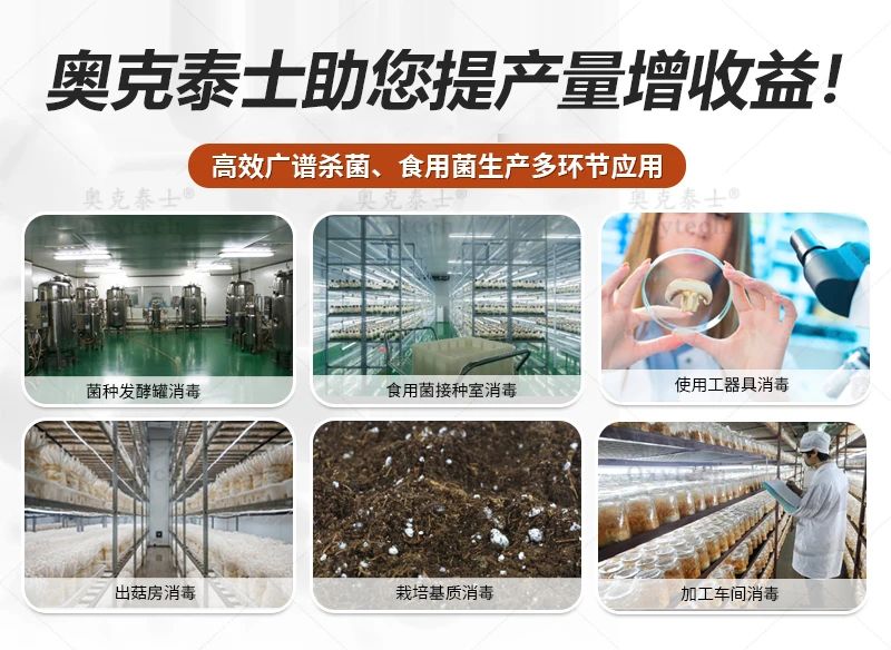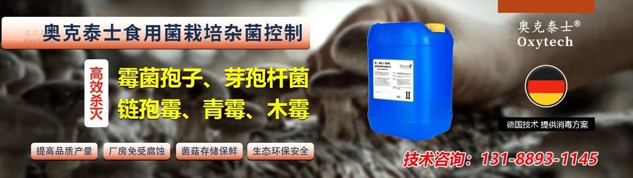 奧克泰士是一種高效型過氧化氫銀離子復(fù)合型消毒劑,可在食用菌栽培的多個關(guān)鍵環(huán)節(jié)進(jìn)行干預(yù),有效預(yù)防鏈孢霉菌污染。具有高效廣譜殺菌優(yōu)勢,生態(tài)環(huán)保、作用完畢后分解產(chǎn)物為水和氧氣,規(guī)避了化學(xué)殘留影響產(chǎn)品口味及人員健康安全;有較好的材料兼容性,對不銹鋼、塑料、橡膠基本無腐蝕。獲得歐盟EMAS生態(tài)認(rèn)證、IFS國際食品標(biāo)準(zhǔn)認(rèn)證等多項嚴(yán)苛的國際權(quán)威認(rèn)證,其安全性和適用性得到充分背書。