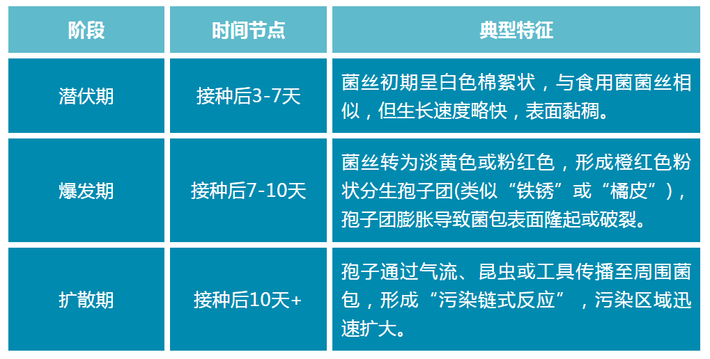 鏈孢霉污染通常經(jīng)歷潛伏期→爆發(fā)期→擴散期三個階段,不同階段表現(xiàn)差異顯著: