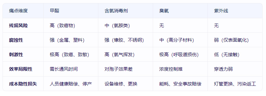 甲醛有殘留高致癌性與腐蝕性、含氯消毒劑腐蝕性與刺激性并存、臭氧消毒濃度控制難與材料兼容性差、紫外線穿透力弱對孢子殺滅有限。