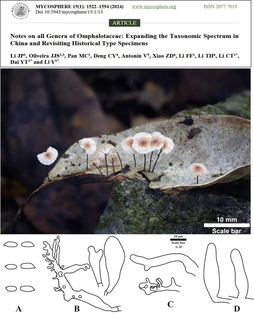 分類學(xué)不僅是物種“新大陸”的發(fā)現(xiàn),更是對生命演化的解碼。2024年9月4日以“Notes on all Genera of Omphalotaceae: Expanding the Taxonomic Spectrum in China and Revisiting Historical Type Specimens”為題在菌物學(xué)期刊Mycosphere(中科院一區(qū)TOP)發(fā)表研究論文,通過形態(tài)學(xué)和分子系統(tǒng)發(fā)育研究建立1個新屬,發(fā)現(xiàn)了15個新種,并提出了9個新組合。其中“周氏裸柄傘”以菌物學(xué)先驅(qū)周宗璜先生命名,用以致敬周宗璜先生的菌物科學(xué)家精神;將“逆型裸腳傘”獨(dú)立為“派氏菇屬”,徹底解決了裸腳傘屬的多系群問題,為類臍菇科的系統(tǒng)進(jìn)化研究開辟了新紀(jì)元。2021級博士研究生李驥鵬為第一作者,李長田教授、李玉院士和代月婷為共同通訊作者。