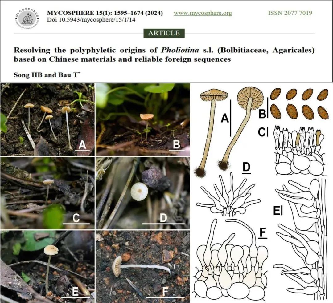 破解真菌分類學(xué)難題,小鱗傘屬家族迎來全新重構(gòu)。2024年9月5日以“Resolving the polyphyletic origins of Pholiotina s.l. (Bolbitiaceae, Agaricales) based on Chinese materials and reliable foreign sequences”為題在菌物學(xué)期刊Mycosphere(中科院一區(qū)TOP)發(fā)表研究論文,將廣義小鱗傘屬拆分為3個獨(dú)立分支,建立2個新屬,發(fā)現(xiàn)17個新物種、11個新組合和2個中國新記錄。并編制了中國糞傘科Bolbitiaceae中各屬、各組和各物種的檢索表,提供了17個新物種和2個新記錄種的描述和線條圖。該研究為小鱗傘屬家族“修訂家譜”。2021級博士研究生宋寒冰為第一作者,圖力古爾教授為通訊作者。
