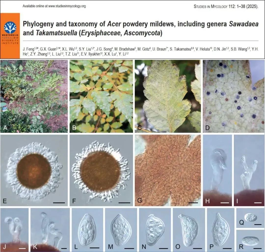 當(dāng)真菌“跨界”感染不同植物時,人類該如何解釋生態(tài)鏈的微妙變化呢?2025年4月25日以“Phylogeny and taxonomy of Acer powdery mildews, including genera Sawadaea and Takamatsuella (Erysiphaceae, Ascomycota)”為題在菌物學(xué)期刊Studies in Mycology(中科院一區(qū)TOP)發(fā)表研究論文,澄清了困擾學(xué)界多年的槭屬植物白粉菌分類爭議。明確侵染槭屬的叉鉤絲殼屬Sawadaea有13個種2個變型,其中新發(fā)現(xiàn)3個新種。澄清了圖拉斯叉鉤絲殼S. tulasnei僅分布于歐洲和美洲,以往分布于亞洲的記錄無效。同時證實叉鉤絲殼屬白粉菌的跨科寄主擴(kuò)張現(xiàn)象;建立全球首個叉鉤絲殼屬與高松氏菌屬的分子系統(tǒng)學(xué)框架,并將“formae(變型)”的分類學(xué)概念應(yīng)用到白粉菌的分類研究中。為全球林木病害防控提供了“精準(zhǔn)靶向”的科學(xué)依據(jù)。2019級博士研究生馮靜為第一作者,已畢業(yè)博士研究生管觀秀為共同第一作者,劉淑艷教授和德國馬丁·路德大學(xué)Uwe Braun教授為共同通訊作者。