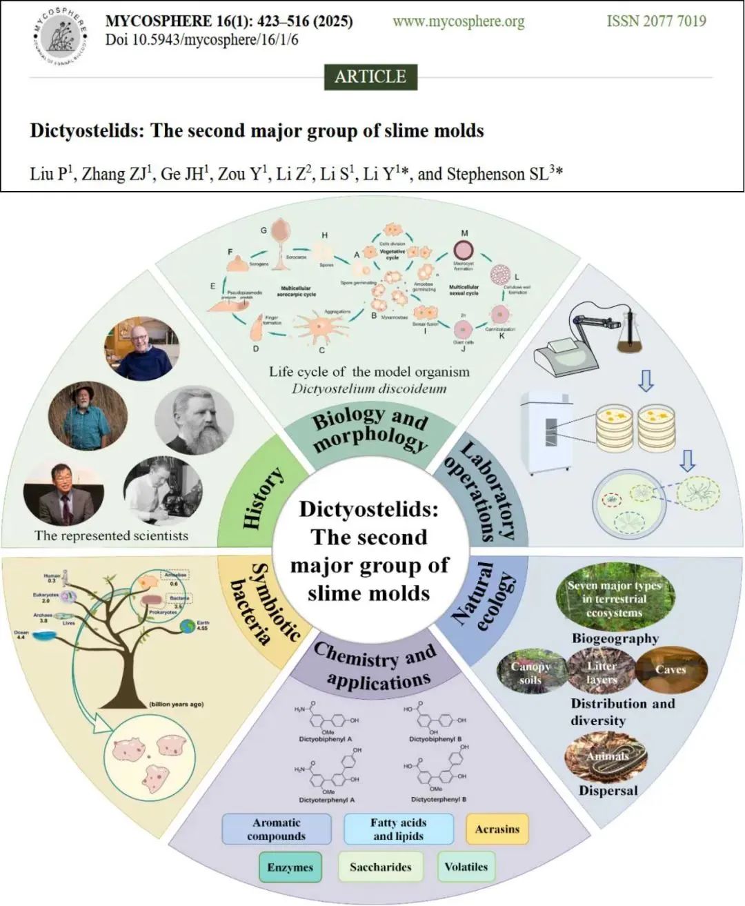 既不是真菌也不是動物,兼具單細(xì)胞與多細(xì)胞生命形態(tài)且能吞噬細(xì)菌——神秘的網(wǎng)柄細(xì)胞狀黏菌究竟蘊(yùn)藏著多少生命奧秘?2025年4月25日以“Dictyostelids: The second major group of slime molds”為題在菌物學(xué)期刊Mycosphere(中科院一區(qū)TOP)發(fā)表綜述論文,完整的梳理了自1869年發(fā)現(xiàn)首個物種毛霉?fàn)罹W(wǎng)柄菌以來的參考文獻(xiàn),系統(tǒng)闡明網(wǎng)柄細(xì)胞狀黏菌的研究歷史、生物學(xué)特性、形態(tài)分類學(xué)特征、系統(tǒng)發(fā)育關(guān)系、生態(tài)學(xué)特征、分離培養(yǎng)技術(shù)、傳播規(guī)律、生物地理模式、生物活性產(chǎn)物及其共生細(xì)菌資源,深入探討網(wǎng)柄細(xì)胞狀黏菌的全球分布與應(yīng)用潛力,揭示其對自然生境的適應(yīng)機(jī)制。論文深化了對網(wǎng)柄細(xì)胞狀黏菌關(guān)鍵研究進(jìn)展的理解,建立其完整的知識體系及多維度的研究框架。劉樸教授為第一作者,李玉院士和美國著名黏菌學(xué)家、阿肯色大學(xué)Steven L. Stephenson教授為共同通訊作者。