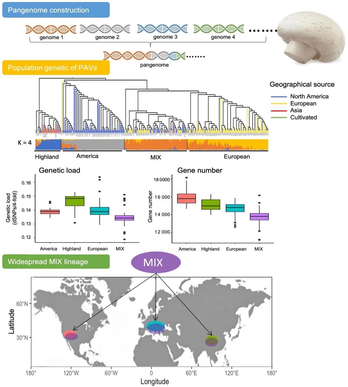 圖1. 基于泛基因組學的雙孢蘑菇的群體遺傳學研究。研究通過泛基因組學揭示雙孢蘑菇MIX譜系在全球擴散過程中發(fā)生遺傳負荷降低、大規(guī)模的基因選擇性丟失的有趣現(xiàn)象