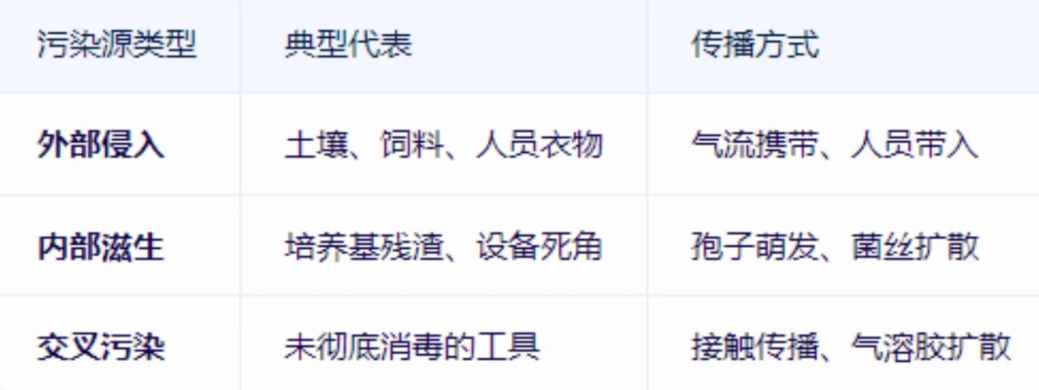 要有效防控霉菌,必須先明確其來源。在工廠化菌種培育車間,污染主要來自以下幾個(gè)方面: