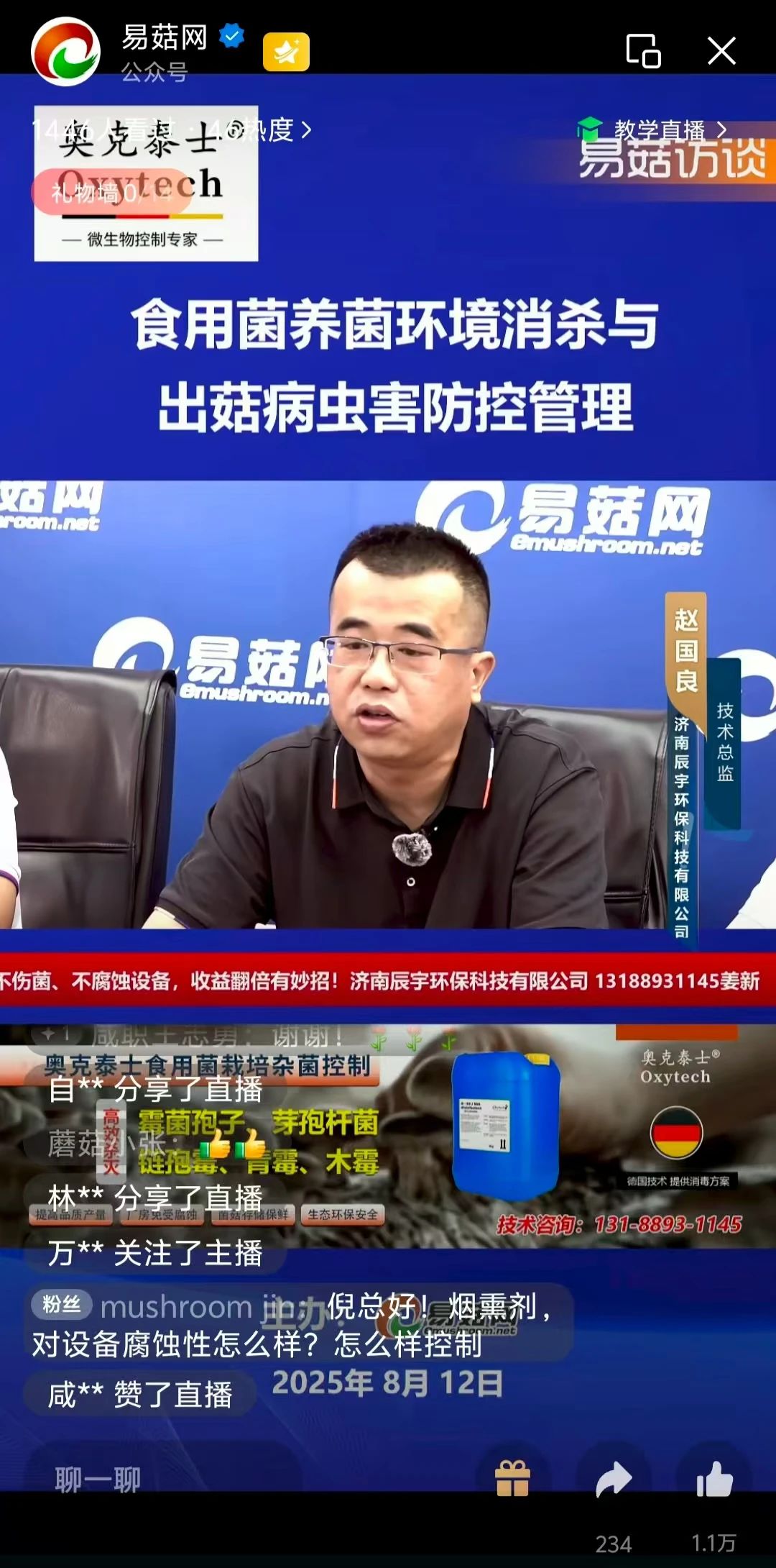在蓬勃發(fā)展的食用菌產(chǎn)業(yè)中,每一份豐收的背后都潛藏著與“隱形對(duì)手”的博弈——微生物污染。它們?nèi)缤瑹o(wú)形的屏障,阻礙著菌絲的健康生長(zhǎng),影響著菇體的品質(zhì)與產(chǎn)量。近日,由濟(jì)南辰宇環(huán)??萍加邢薰荆▕W可泰士消毒劑)獨(dú)家冠名的易菇訪談:食用菌養(yǎng)菌環(huán)境消殺與出菇病蟲(chóng)害防控管理直播活動(dòng)中,業(yè)內(nèi)專(zhuān)家針對(duì)食用菌養(yǎng)殖中的微生物污染難題及環(huán)境消殺關(guān)鍵技術(shù)展開(kāi)深入分享,為從業(yè)者揭開(kāi)了這場(chǎng)“微觀戰(zhàn)爭(zhēng)”的神秘面紗。