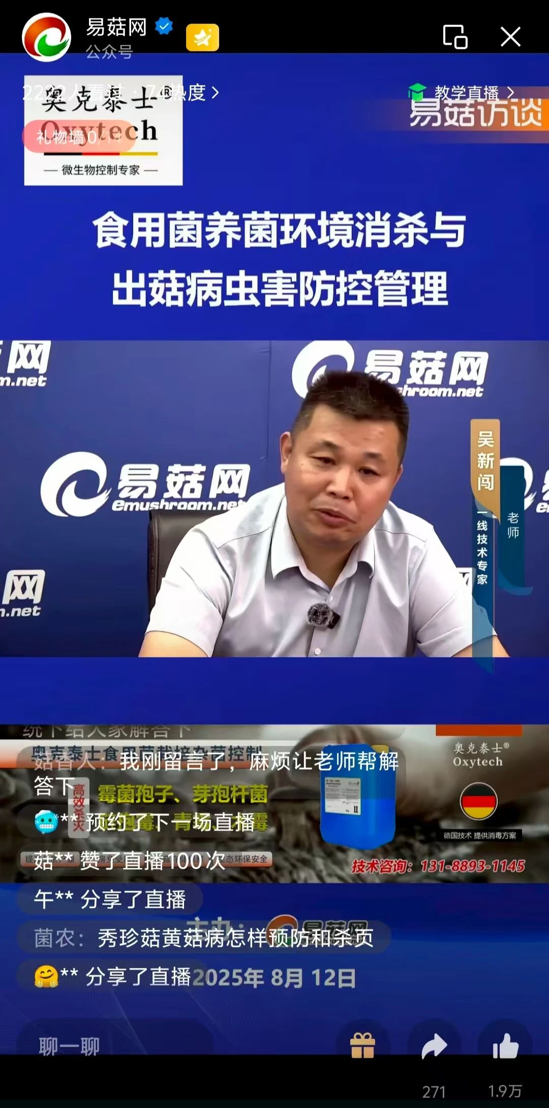 2025年8月12日,由濟(jì)南辰宇環(huán)??萍加邢薰荆▕W可泰士消毒劑)獨(dú)家冠名的易菇訪談直播活動成功舉辦。本次訪談以“食用菌養(yǎng)菌環(huán)境消殺與出菇病蟲害防控管理”為主題,邀請了三位在食用菌行業(yè)深耕多年的實(shí)戰(zhàn)專家,為廣大網(wǎng)友深入解析食用菌種植過程中的病蟲害防控難題,助力種植戶從“經(jīng)驗(yàn)種菇”邁向“科學(xué)種菇”。