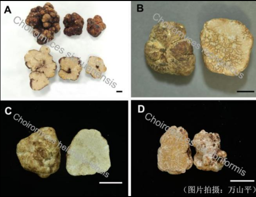 我國(guó)真菌學(xué)研究人員在西南地區(qū)與內(nèi)蒙古地區(qū)通過(guò)市場(chǎng)調(diào)研、野外采集,及詳盡的形態(tài)學(xué)觀察和分子系統(tǒng)發(fā)育分析證實(shí):市場(chǎng)上早熟的“白松露”實(shí)為子囊菌門(mén)、盤(pán)菌目、塊菌科、豬塊菌屬,且該類(lèi)群存在兩個(gè)新物種——四川豬塊菌、蒙古豬塊菌。