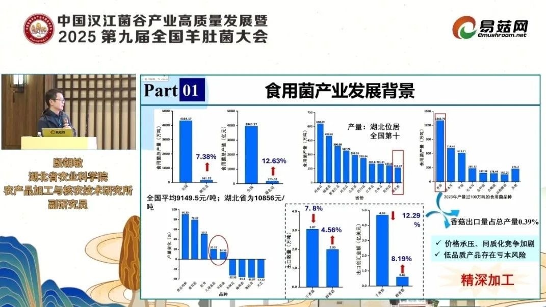 數(shù)據(jù)顯示,2023年全國食用菌產(chǎn)量達(dá)4334.17萬噸,產(chǎn)值3965.57億元。湖北省產(chǎn)量雖僅居全國第十(116.22萬噸),但單位產(chǎn)值(10856元/噸)顯著高于全國平均水平(9149.5元/噸),表明產(chǎn)品優(yōu)質(zhì)性突出。然而,年產(chǎn)量1303萬噸的香菇,出口量僅約5萬噸,僅占總產(chǎn)量的0.39%,凸顯國內(nèi)市場競爭激烈,“價格承壓、同質(zhì)化嚴(yán)重”成為行業(yè)痛點。