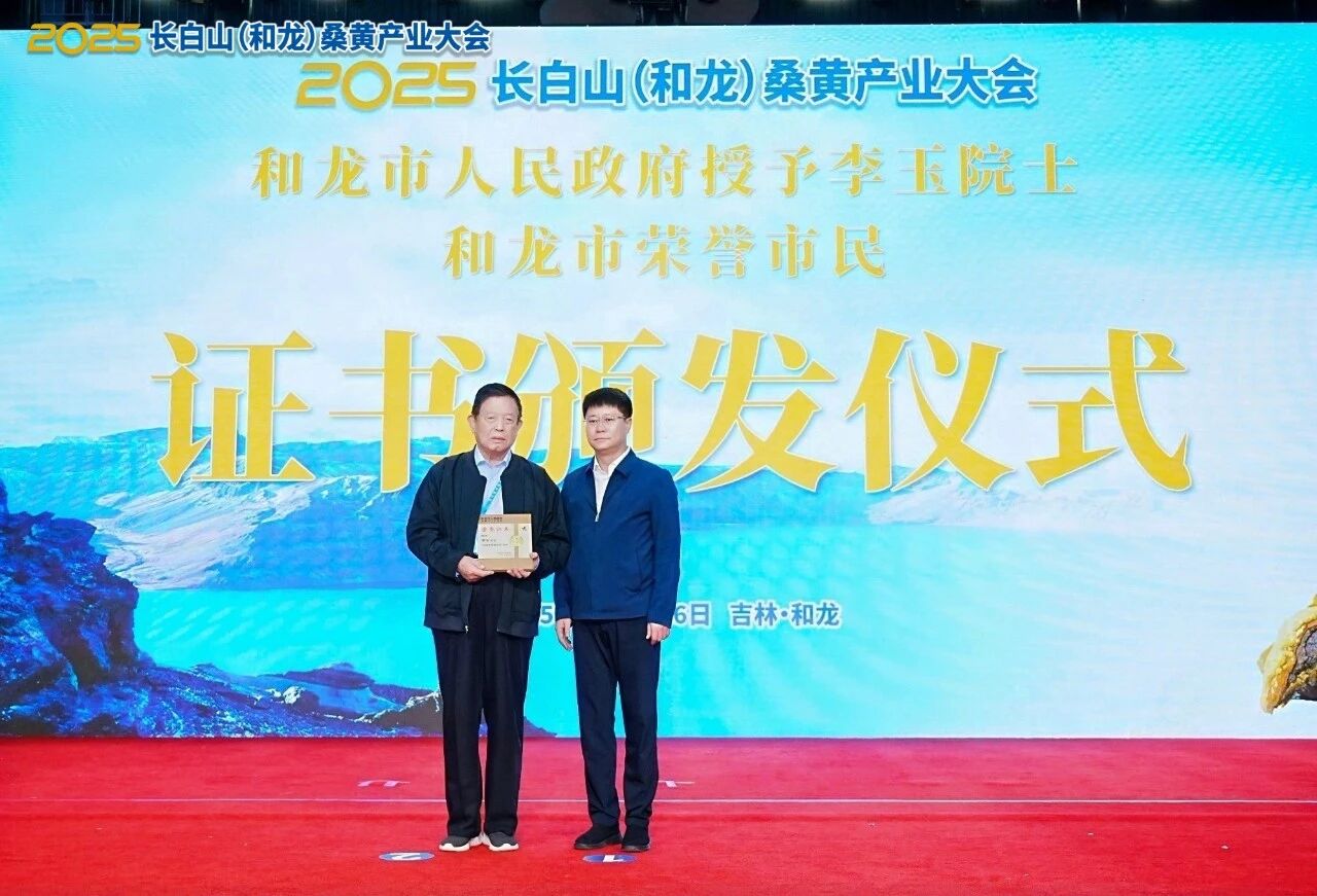 為感謝李玉院士對長白山桑黃產(chǎn)業(yè)乃至全國菌物事業(yè)發(fā)展所付出的深情厚誼與杰出貢獻(xiàn),和龍市人民政府聘請李玉院士為“和龍市榮譽(yù)市民”。和龍市委副書記、和龍市人民政府市長樸哲萬同志上臺(tái)頒發(fā)證書。隨后,李玉院士向吉林桑黃生物科技集團(tuán)有限公司桑黃研究院捐贈(zèng)其團(tuán)隊(duì)編著的食藥用菌專著。