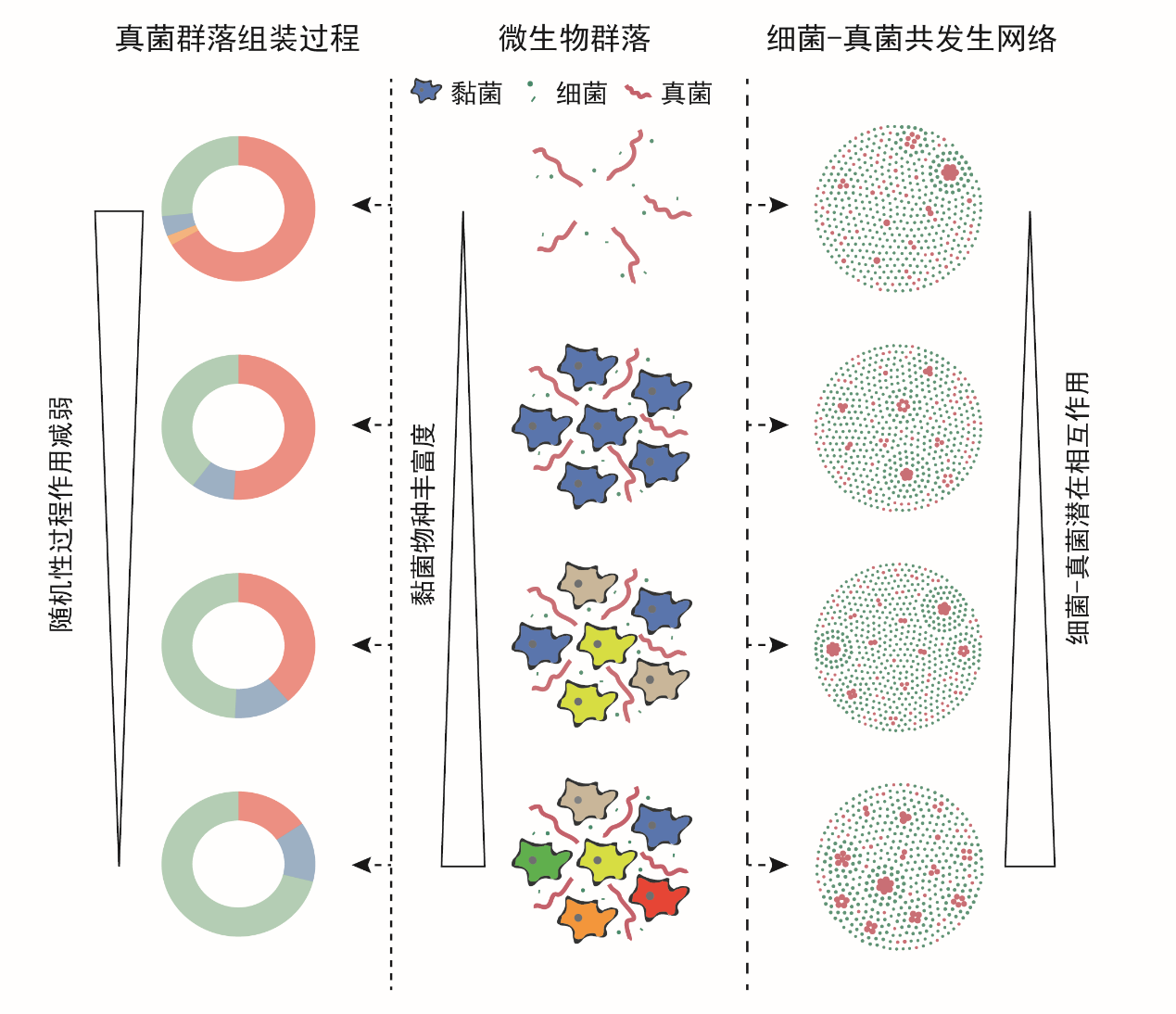 圖2. 不同黏菌豐富度梯度下真菌群落組裝過程與真菌-細(xì)菌共發(fā)生網(wǎng)絡(luò)的變化趨勢