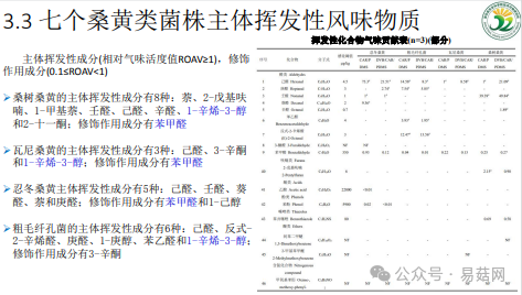隨后,周洪英副研究員還詳細(xì)分享了對(duì)七個(gè)桑黃類菌株揮發(fā)性風(fēng)味物質(zhì)組成的研究分析,并深入分析了培養(yǎng)時(shí)間對(duì)揮發(fā)性風(fēng)味物質(zhì)的影響。