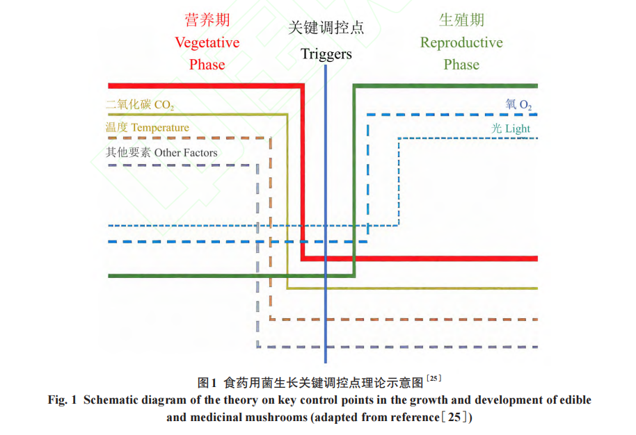 在食藥用菌栽培過程中,張樹庭根據(jù)生長發(fā)育期間環(huán)境與養(yǎng)分需求的變化規(guī)律,提出關鍵調控點理論(圖1)[25]。該理論強調食藥用菌生長發(fā)育分為營養(yǎng)期與生殖期兩個關鍵階段,其轉換受到各種環(huán)境因素的影響,比如CO2、溫度、氧氣和光照等。不同階段食藥用菌的生長需求是不同的,營養(yǎng)期菌絲體分解基質,積累大量碳源和氮源營養(yǎng)物質,需要合適的溫度促進高酶活,但對空氣和光照需求低;而生殖期則相反,需充足光照和氧氣以誘導子實體形成。關鍵調控點在于精準把握環(huán)境觸發(fā)時機,避免過早暴露于光照、氧氣、水分等因素刺激中,否則影響產量形成所以生產者需要根據(jù)科學知識和實踐經驗,精確控制這個時機,才能獲得好的收成;該理論強調科學知識與實踐經驗的結合,既要理解食藥用菌生長的科學原理,又要有實際栽培的經驗來把握最佳時機。